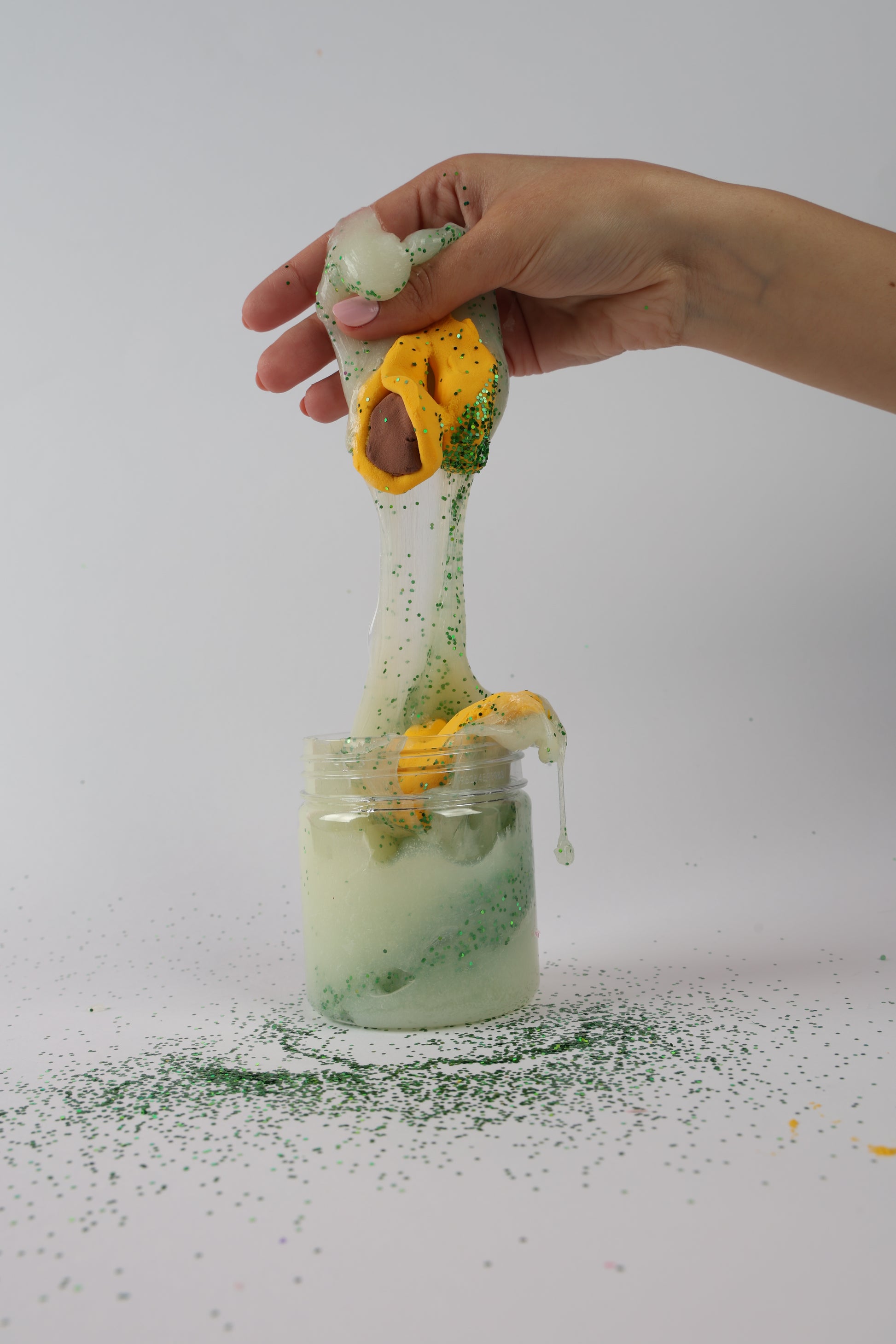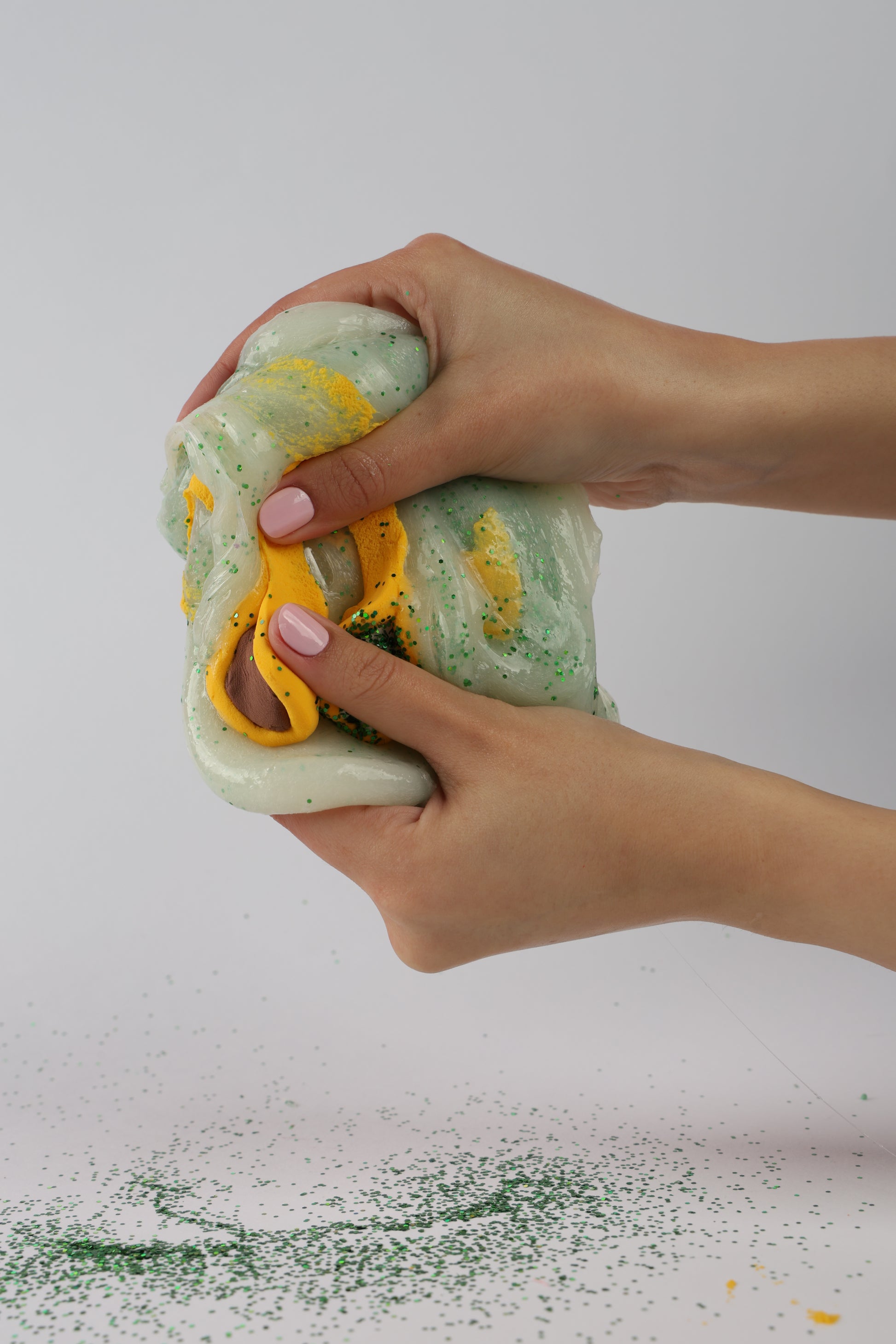 Slime is hand-made. Squeezing is known to release tense muscles associated with stress. Playing with it has a soothing feeling. Small parts can be a choking hazard. Keep away from infants and pets (sofas, clothing and hair too).