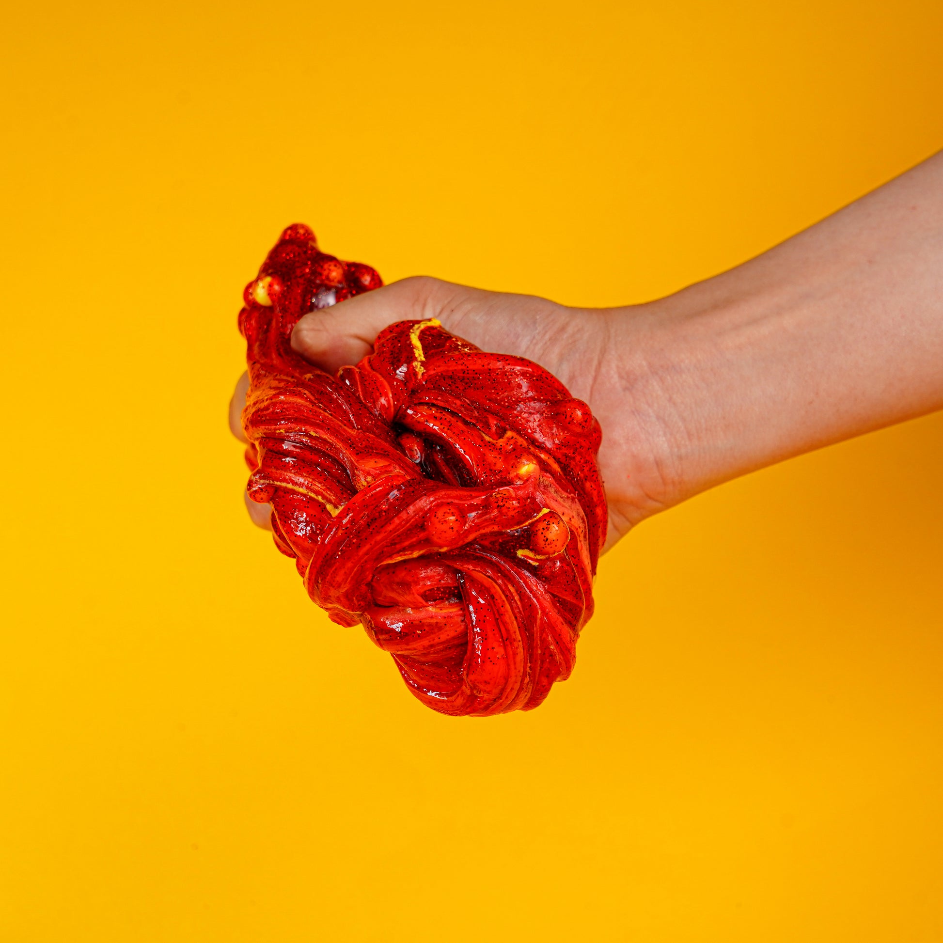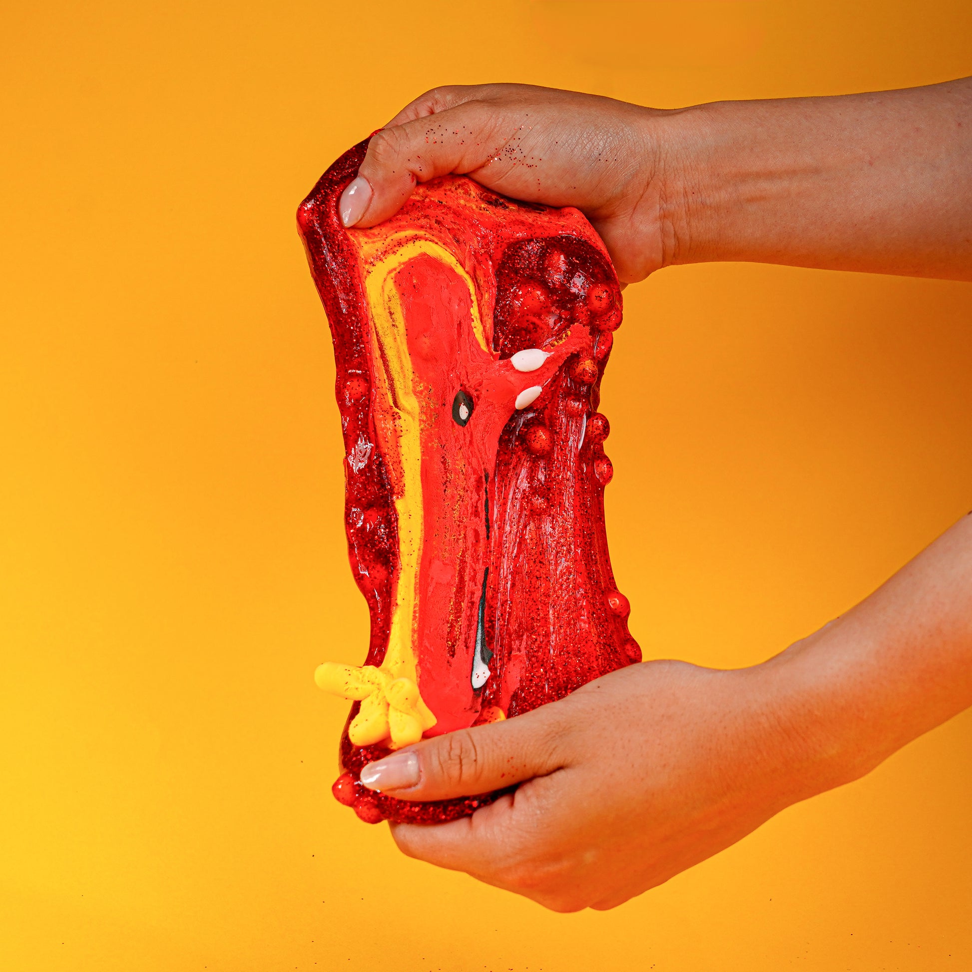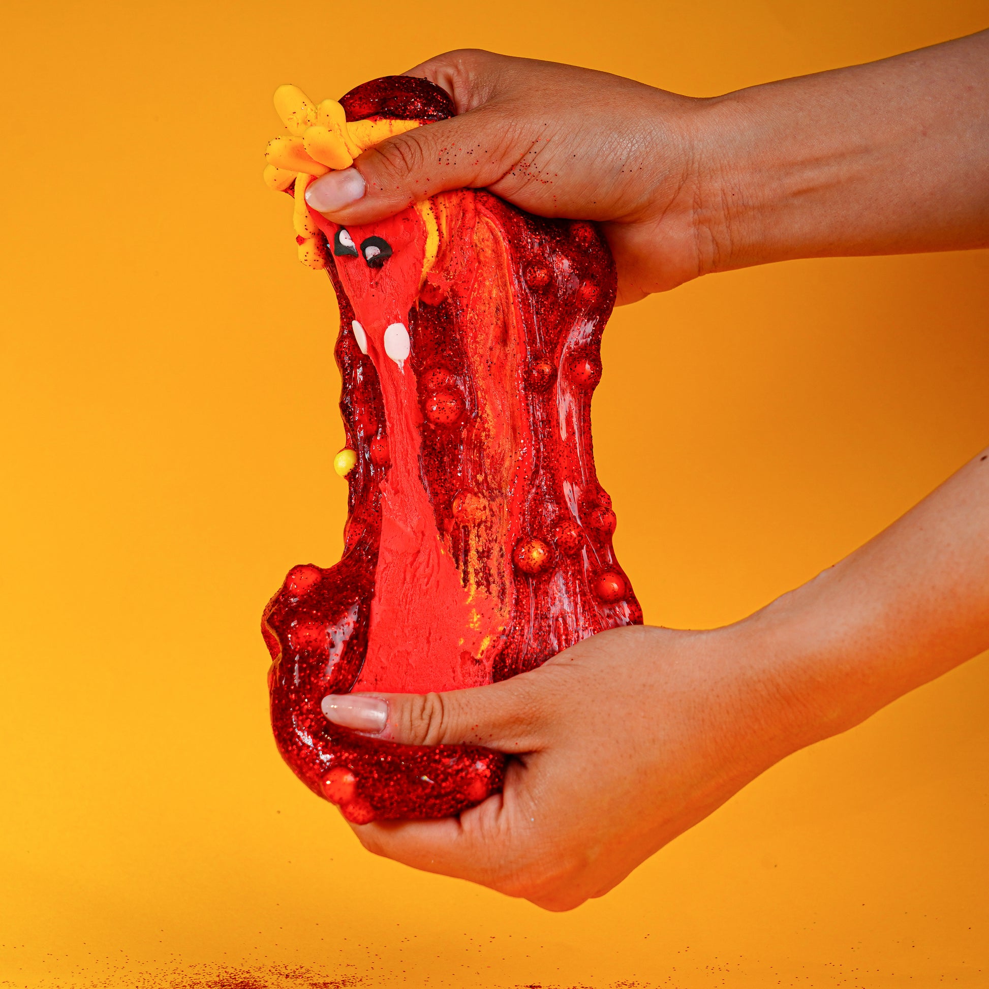 الزينة : معجونة الصلصال على شكل بطاطا مقلية ،البريق الاحمر مع كرات الفوم الصفراء